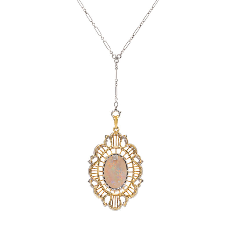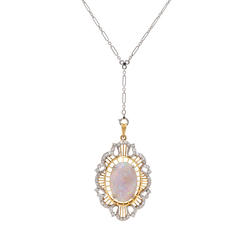 Containing one oval cabochon opal measuring approximately 20.85 x 14.35 x 6.00 mm and 56 round brilliant cut diamonds weighing approximately 0.80 carat. Mounted bicolor gold with white gold fancy link chain.