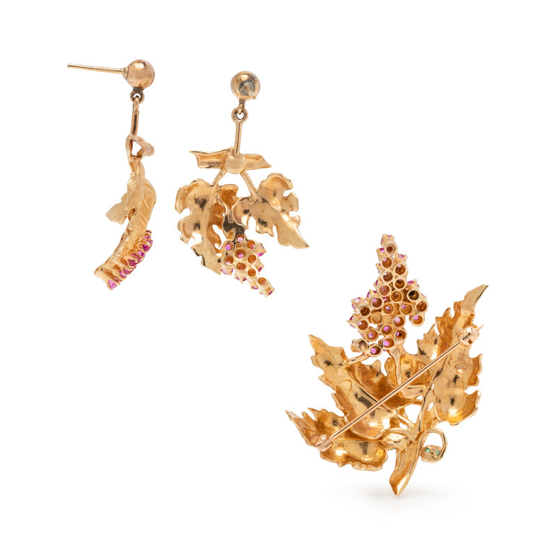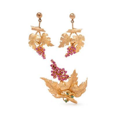 Consisting of a brooch with textured gold grape leaves, 23 round mixed cut pink sapphires and three round mixed cut emeralds, together with a pair of matching earrings containing 18 round mixed cut pink sapphires.