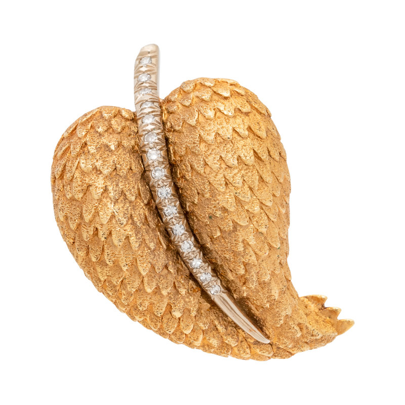 Consisting of a textured yellow gold leaf with white gold vein containing 15 single cut diamonds.