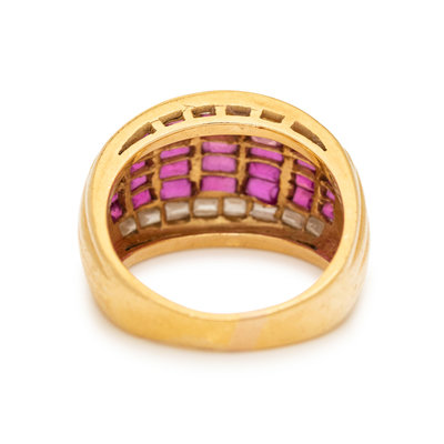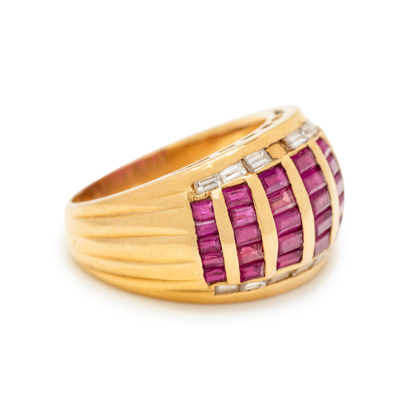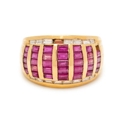 Containing 34 baguette cut rubies measuring approximately 1.75 x 1.30 mm to 2.90 x 1.80 mm and 15 baguette cut diamonds weighing approximately 0.45 carat total. Mounted in yellow gold.