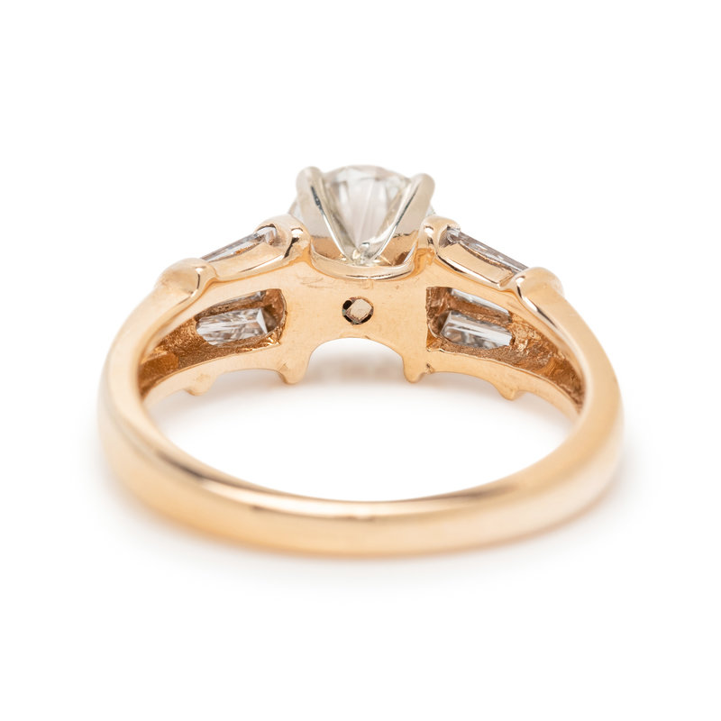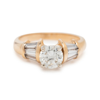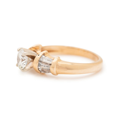 Containing one round brilliant cut diamond weighing 0.72 carat and six tapered baguette cut diamonds weighing approximately 0.25 carat total. Mounted in yellow gold.