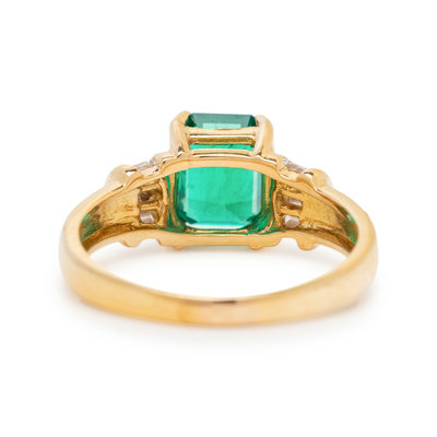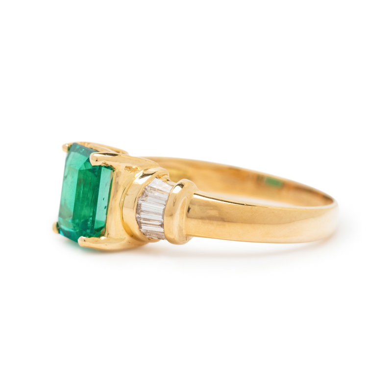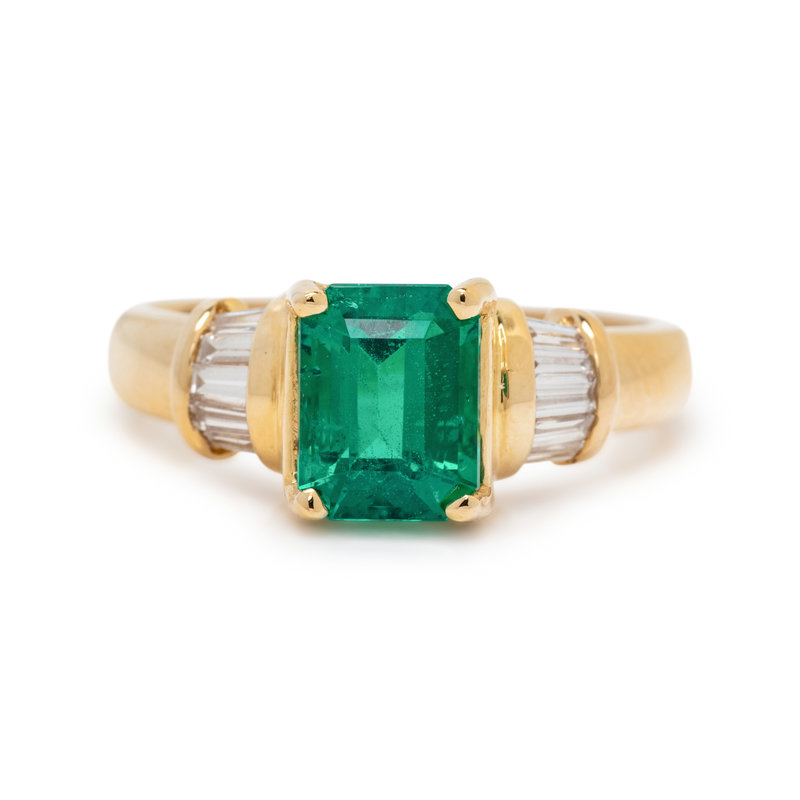 Containing one emerald cut emerald measuring approximately 8.40 x 6.45 x 4.75 mm and 10 baguette cut diamonds weighing approximately 0.35 carat total. Mounted in yellow gold.