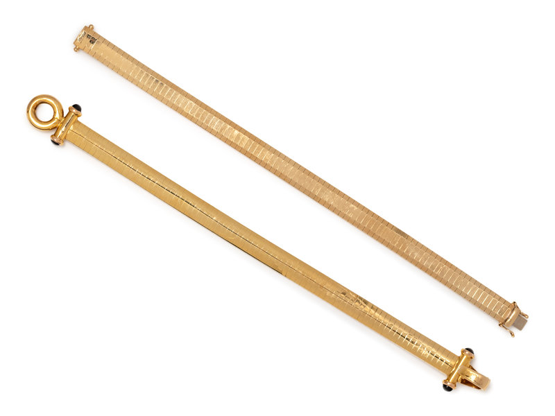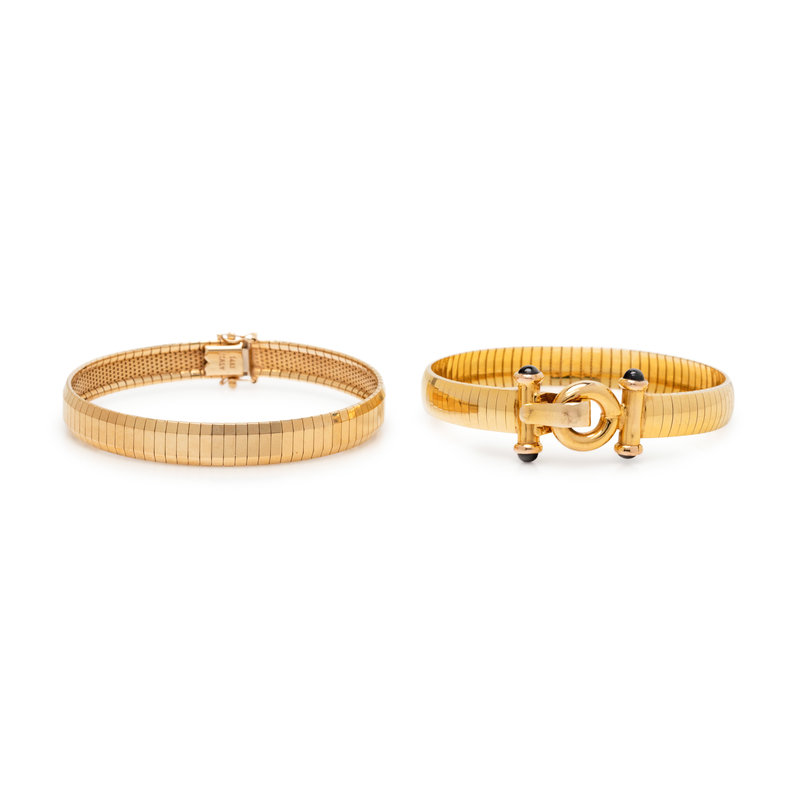 Consisting of a bracelet containing a hook and eye clasp with cabochon gemstones measuring approximately 8.00 mm wide, together with a polished bracelet measuring approximately 8.00 mm wide.