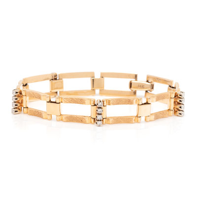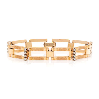 Consisting of rectangular links with Florentine finish, with connector links containing 16 round brilliant cut diamonds weighing approximately 0.30 carat total.
