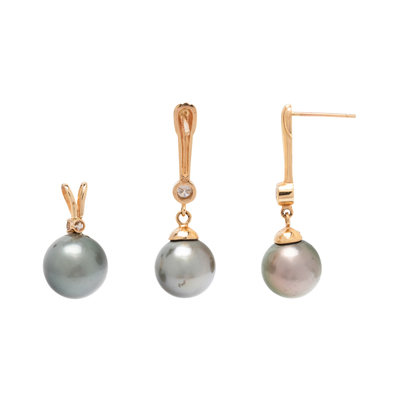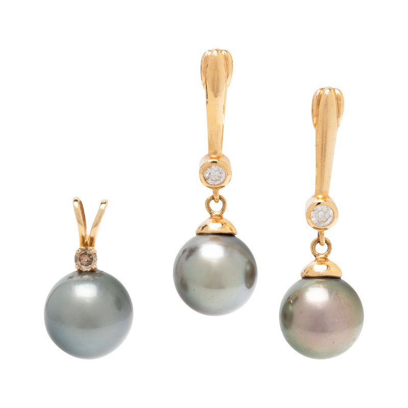 Consisting of a pair of earrings containing two Tahitian pearls measuring approximately 10.40 mm in diameter and two round brilliant cut diamonds weighing approximately 0.15 carat total, together with a pendant containing one Tahitian pearl measuring approximately 11.00 mm in diameter and one round brilliant cut diamond. Mounted in yellow gold.