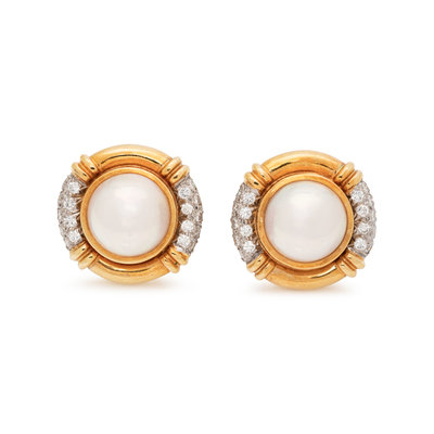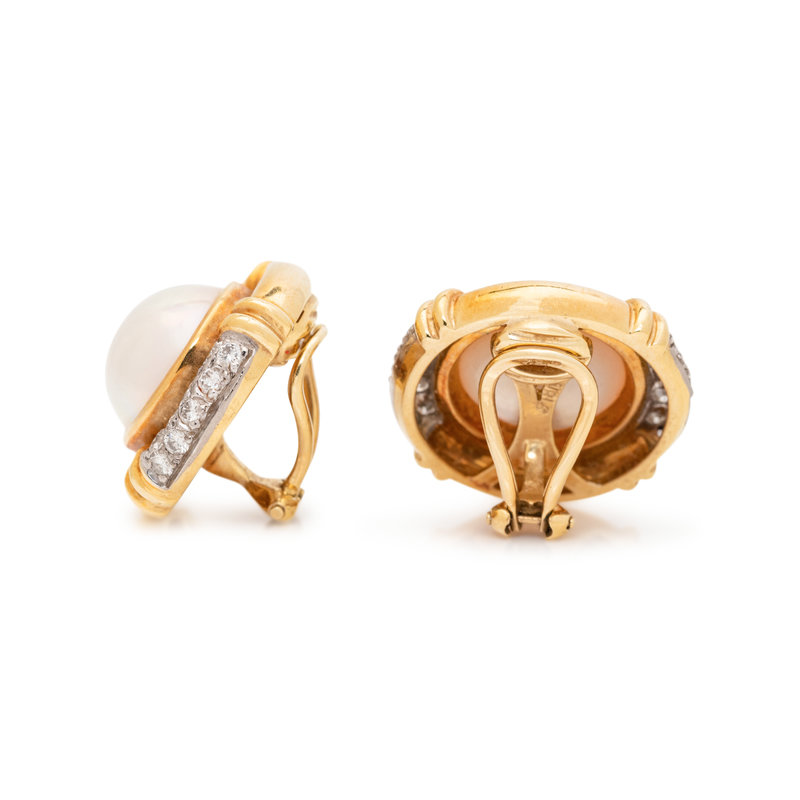 CULTURED MABE PEARL AND DIAMOND EARCLIPS