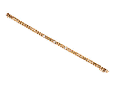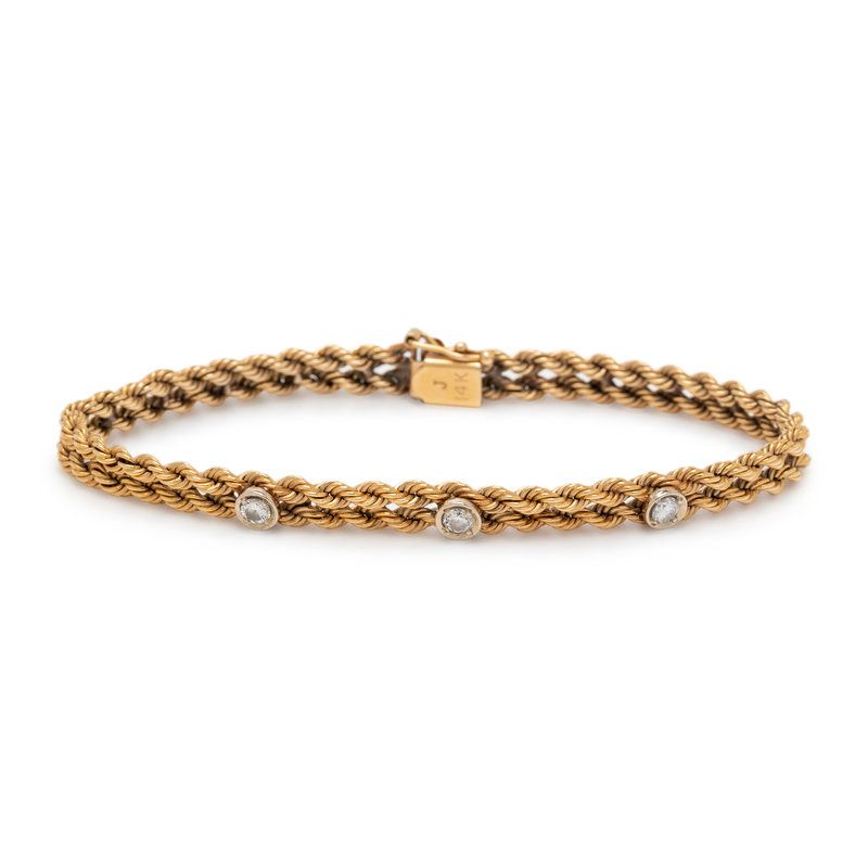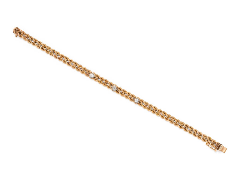 Consisting of two attached rope chains surmounted with three round brilliant cut diamonds weighing approximately 0.20 carat total.