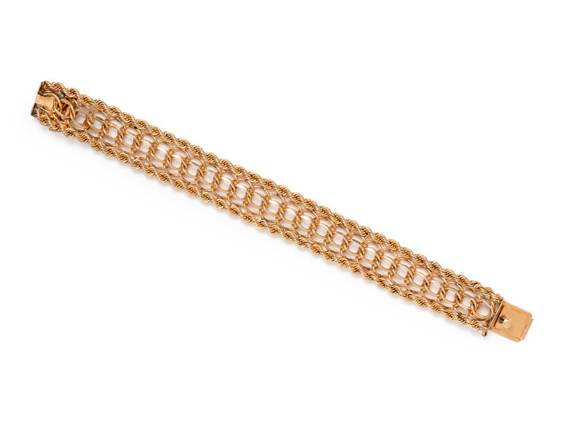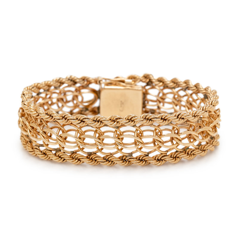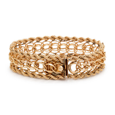 Consisting of a fancy link chain edged with two attached rope chains, measuring approximately 18.00 mm wide.