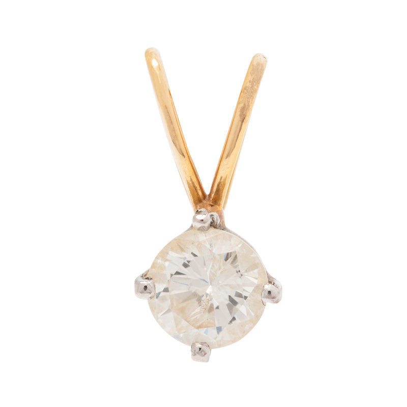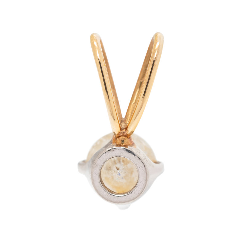 Containing one round brilliant cut diamond weighing approximately 0.75 carat. Mounted in platinum and yellow gold.