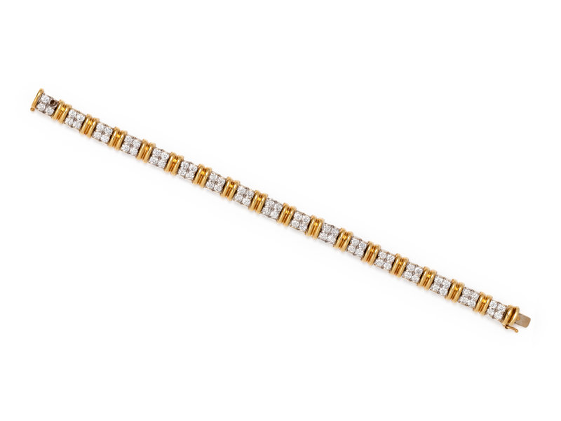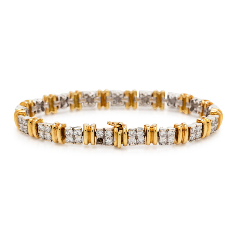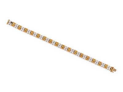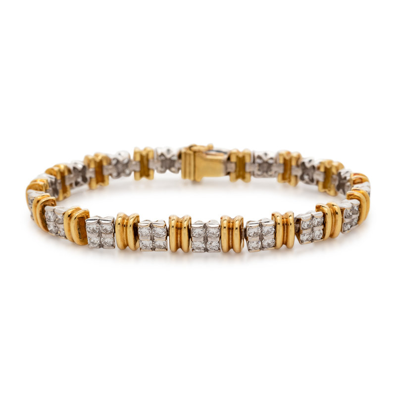 Consisting of white gold links containing 67 round brilliant cut diamonds weighing approximately 4.00 carats total, alternating with yellow gold links.