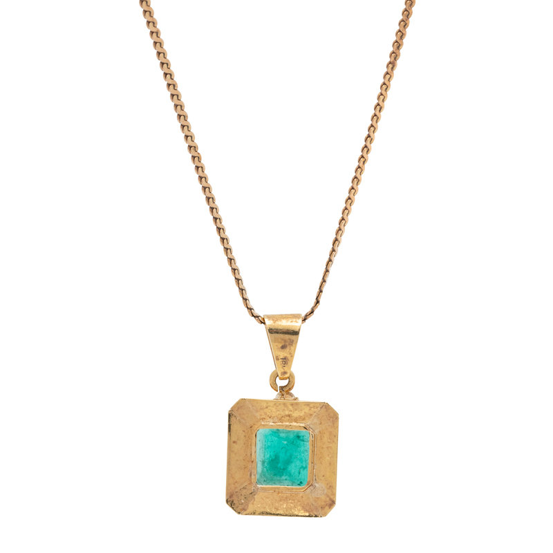 Consisting of a pendant containing one emerald cut emerald measuring approximately 8.95 x 7.90 x 6.20 mm and three round brilliant cut diamonds, suspended from a serpentine chain necklace.