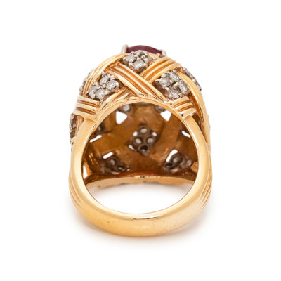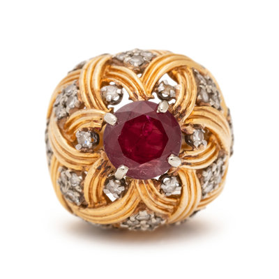 Containing one round mixed cut ruby measuring approximately 8.25 mm in diameter and 54 single cut diamonds weighing approximately 0.50 carat total. Mounted in bicolor gold.