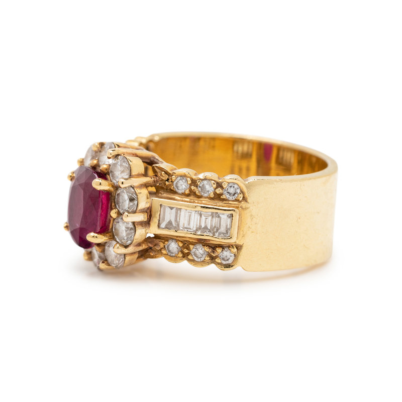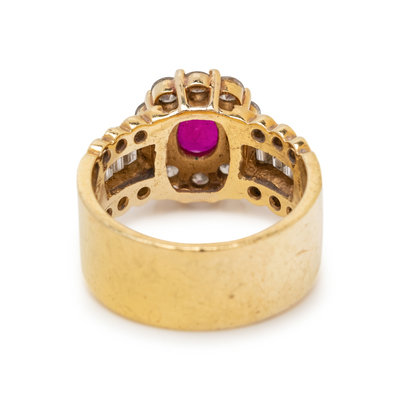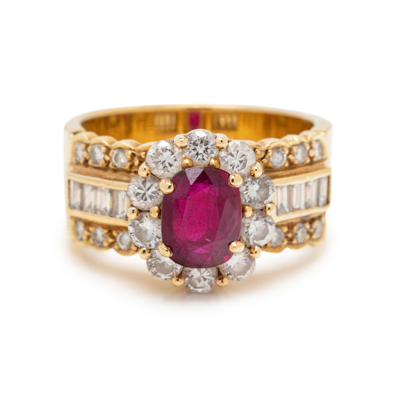 Containing one cushion mixed cut ruby measuring approximately 7.40 x 5.75 x 3.15 mm, eight baguette cut diamonds weighing approximately 0.30 carat total and 22 round brilliant cut diamonds weighing approximately 0.75 carat total. Mounted in yellow gold.
