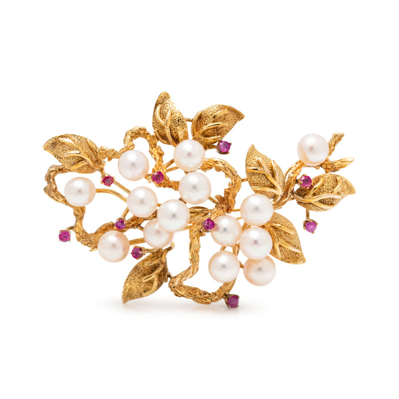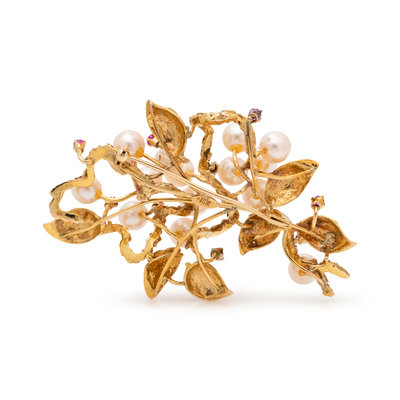 Consisting of textured yellow gold branches and leaves containing 14 pearls measuring approximately 7.00 mm in diameter and 10 round mixed cut rubies.