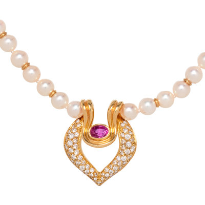 Consisting of a pendant containing one oval mixed cut pink sapphire measuring approximately 5.60 x 3.80 x 3.40 mm, 65 round brilliant cut diamonds weighing approximately 0.45 carat total, suspended from a necklace containing pearls measuring approximately 5.10 mm in diameter, interspersed with gold spacer beads.