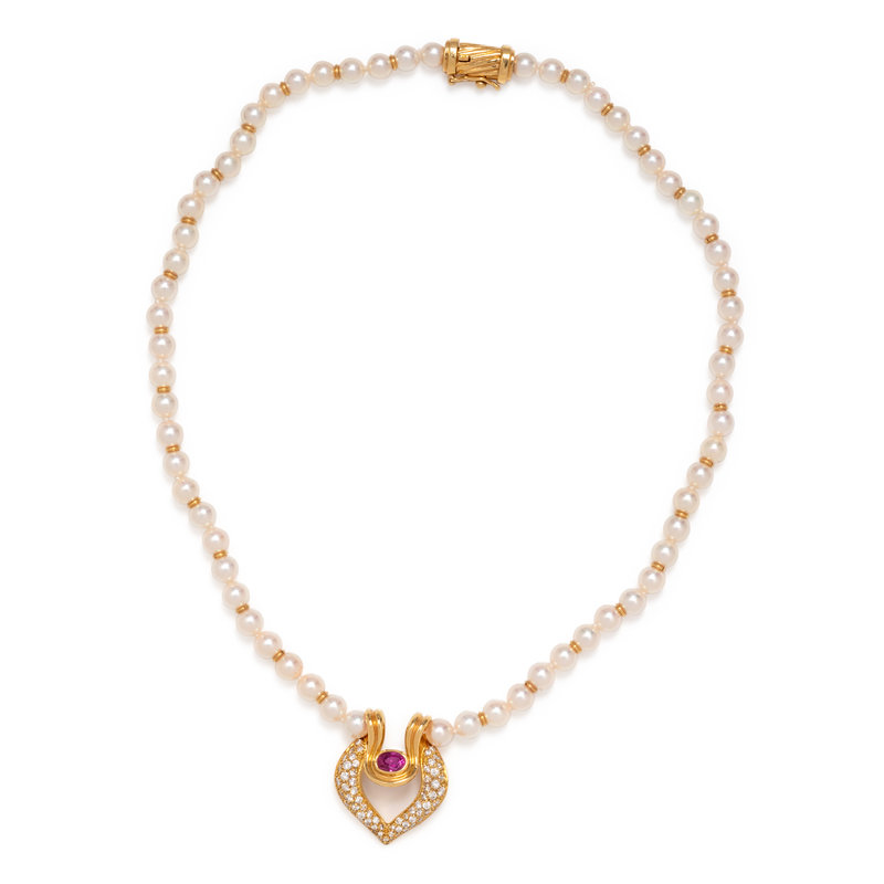 PINK SAPPHIRE, DIAMOND AND CULTURED PEARL NECKLACE