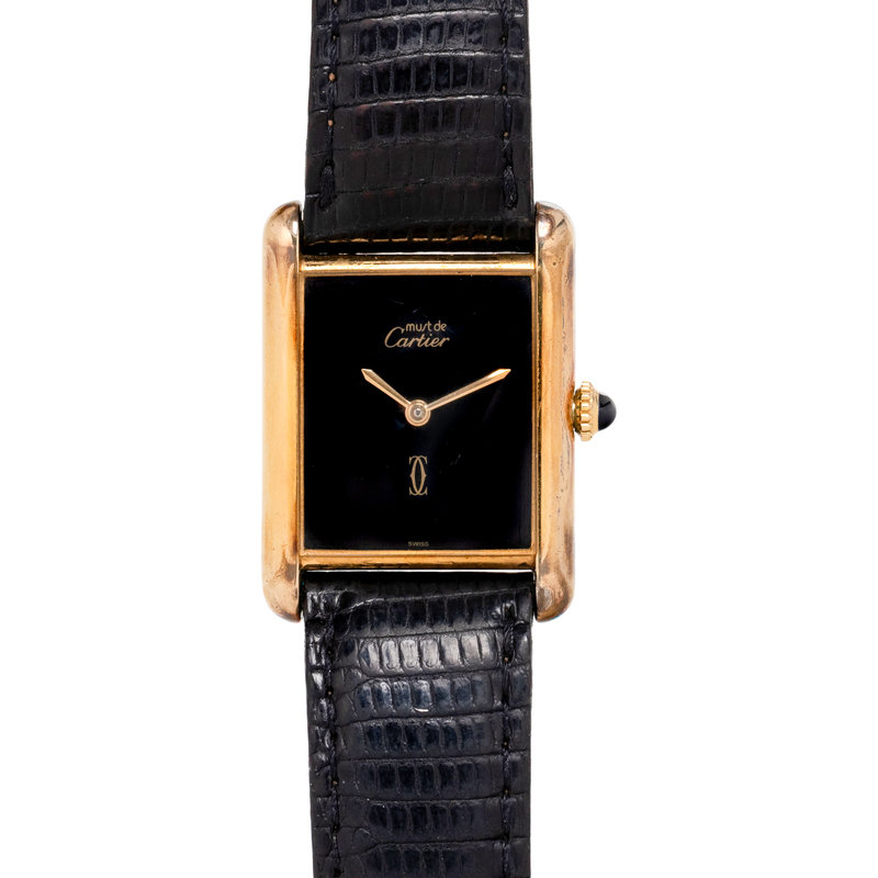 30.00 x 22.00 mm case dimensions inclusive of lugs, black dial, manual wind movement, black leather strap signed Cartier, gold tone tang buckle.