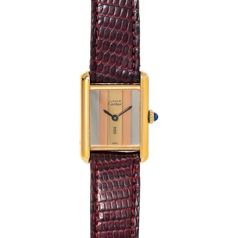 27.00 x 20.00 mm case dimensions inclusive of lugs, tricolor dial with silver and yellow and rose gold vermeil, manual wind movement, maroon leather strap signed must de Cartier, gold tone tang buckle.