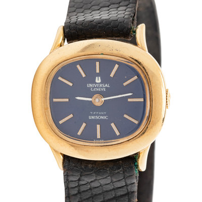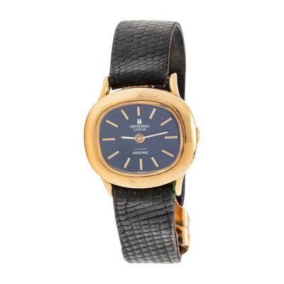 26.00 x 23.00 mm case dimensions, blue dial, gold baton numerals, 13 jewel quartz movement signed UNIVERSAL GENEVE, black leather strap, yellow gold deployant clasp.