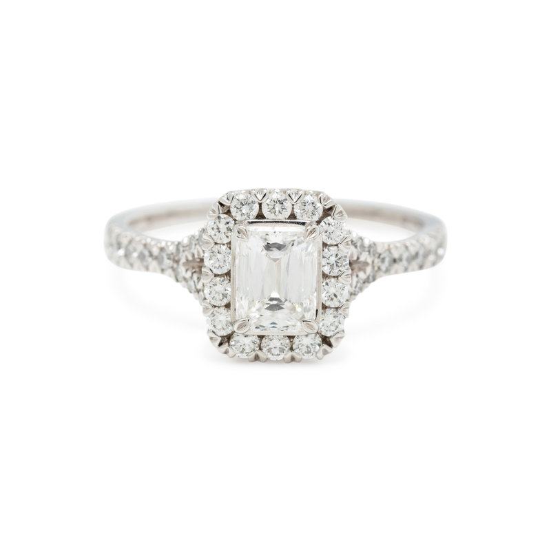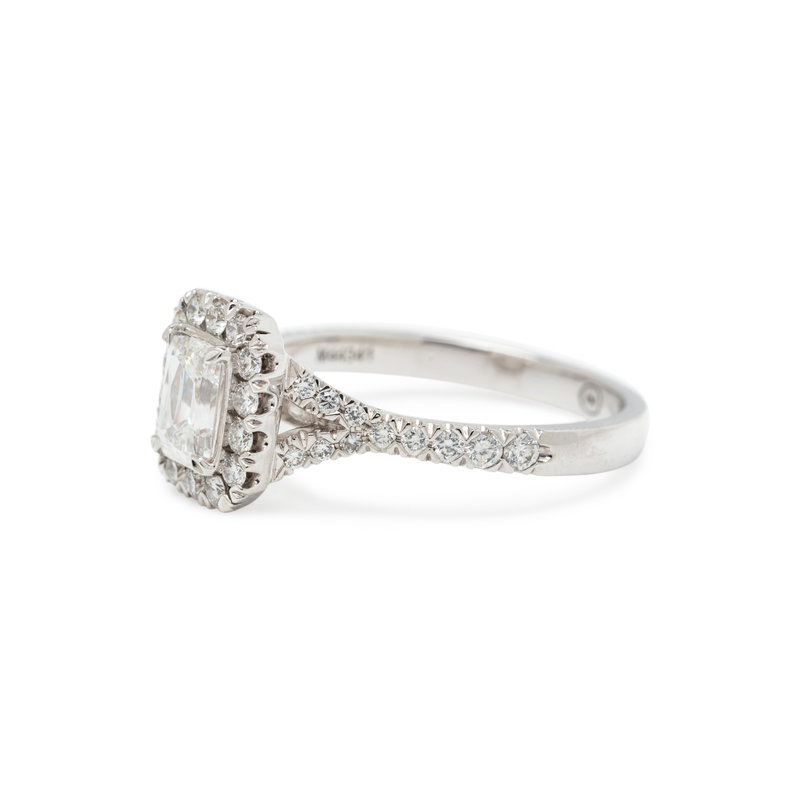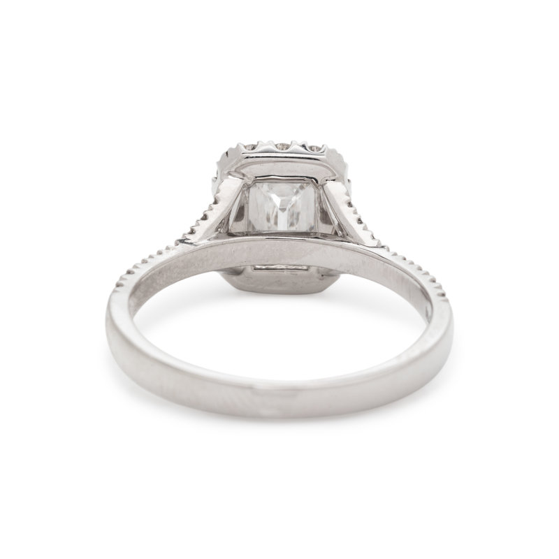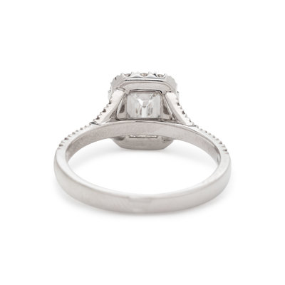 Containing one cut-cornered rectangular modified brilliant cut diamond weighing 0.74 carat and 36 round brilliant cut diamonds weighing approximately 0.45 carat total. Mounted in white gold.
