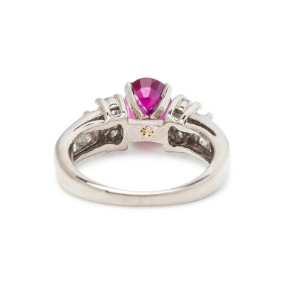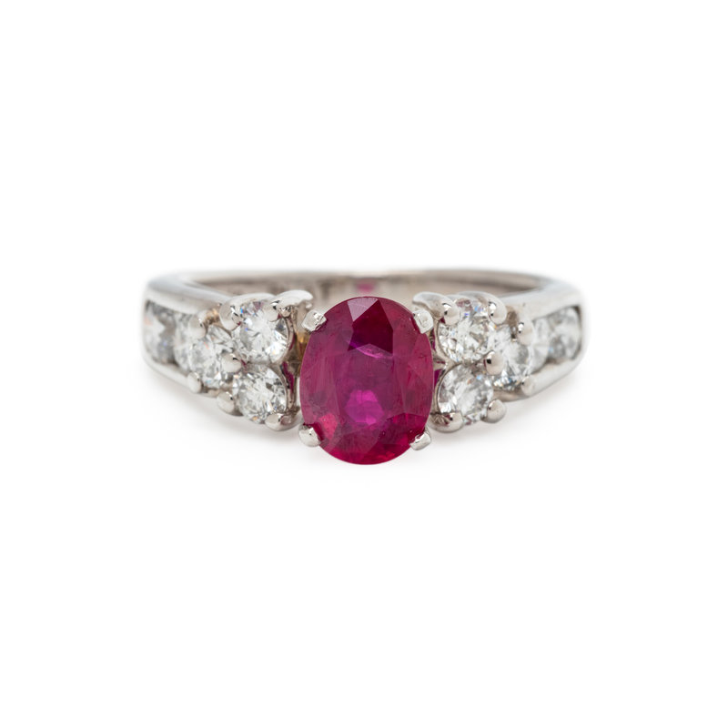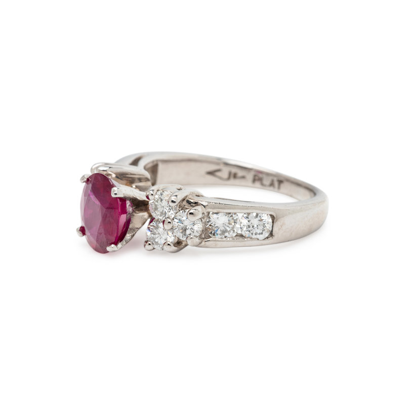 Containing one oval mixed cut ruby measuring approximately 7.45 x 5.75 mm and eight round brilliant cut diamonds weighing approximately 1.00 carat total. Mounted in platinum.