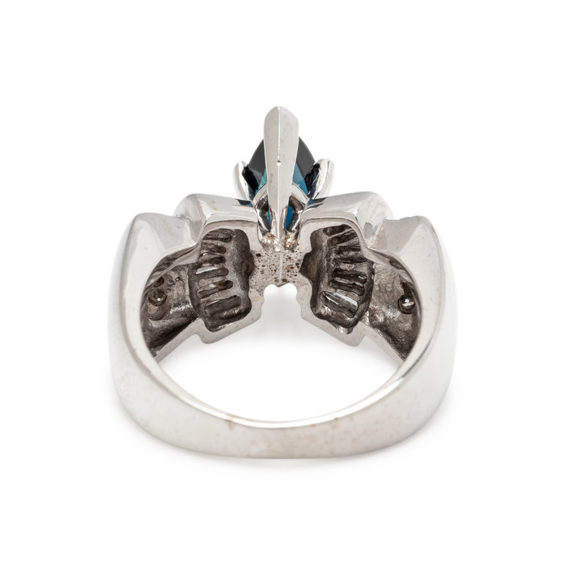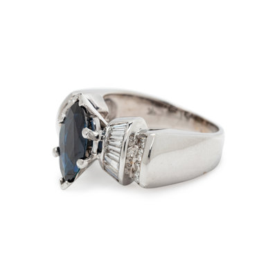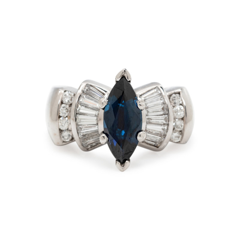 Containing one marquise cut synthetic sapphire measuring approximately 12.30 x 5.45 mm, 14 tapered baguette cut diamonds and eight round brilliant cut diamonds weighing approximately 0.75 carat total. Mounted in white gold.