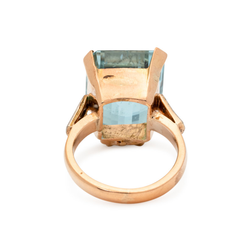 Containing one emerald cut aquamarine measuring approximately 13.95 x 12.60 x 10.00 mm and eight single cut diamonds. Mounted in bicolor gold.