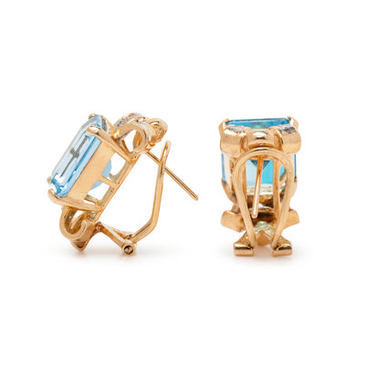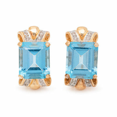 Containing two emerald cut blue topaz measuring approximately 11.95 x 10.00 to 10.15 x 6.45 mm and 16 round brilliant and single cut diamonds, posts with clip backs. Mounted in yellow gold with white gold detail.