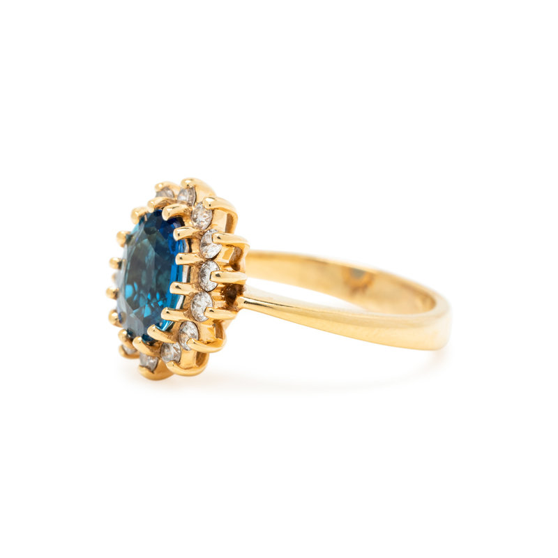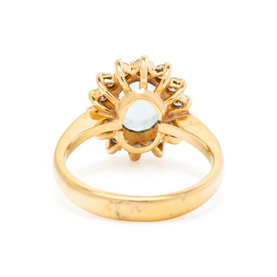 Containing one oval mixed cut aquamarine measuring approximately 8.50 x 6.60 x 3.45 mm and 14 round brilliant cut diamonds weighing approximately 0.25 carat total. Mounted in yellow gold.