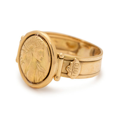 Consisting of a pair of earrings depicting the profile of a woman, together with a ring depicting the profile of a man.