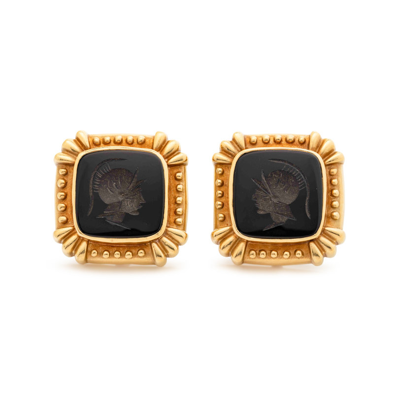 Containing two cushion shaped onyx intaglios depicting the profile of a soldier.
