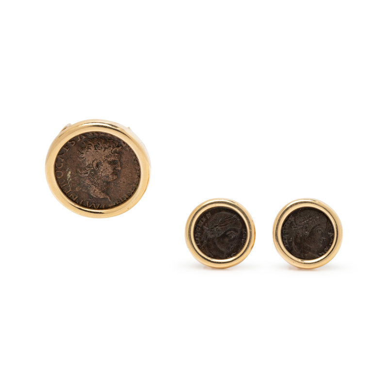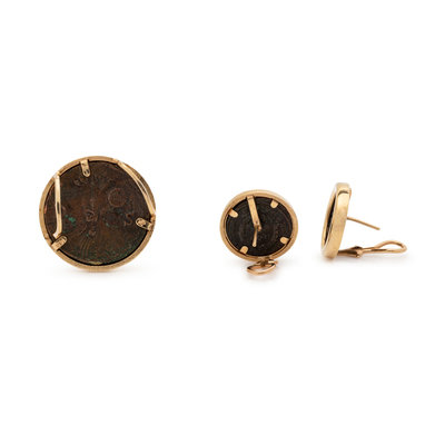 Consisting of a pair of earclips containing two ancient Roman coins measuring approximately 18.00 mm in diameter, with yellow gold surround, posts with clip backs, together with a slide pendant containing one ancient Roman coin measuring approximately 28.00 mm in diameter.