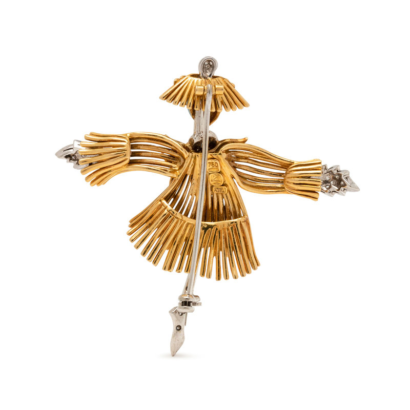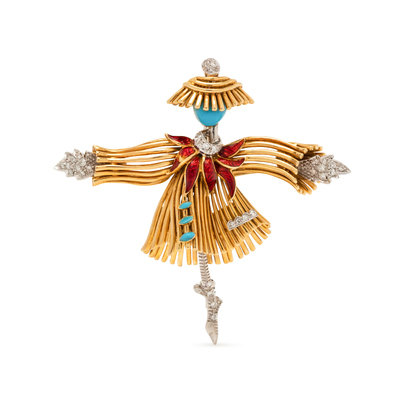 Consisting of a yellow gold scarecrow with blue and red enamel with white gold details containing 32 single cut diamonds.