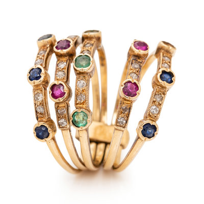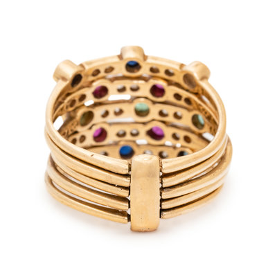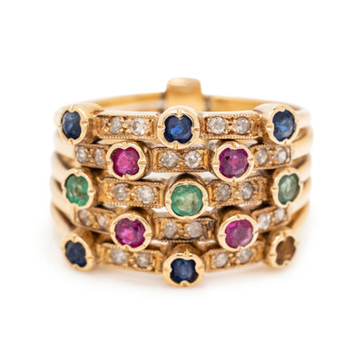 Containing five round mixed cut sapphires, four round mixed cut rubies, three round mixed cut emeralds and 24 single cut diamonds. Mounted in yellow gold.