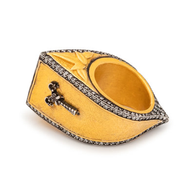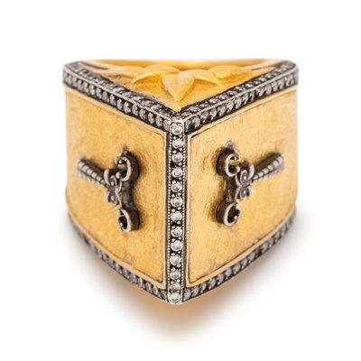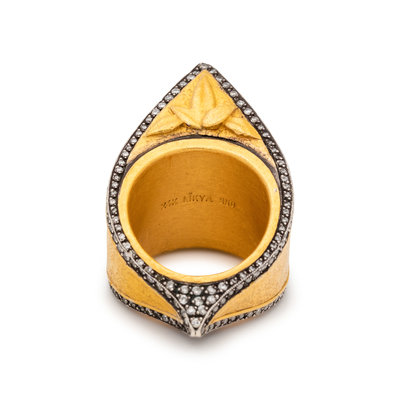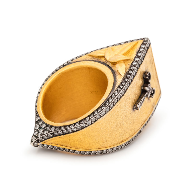 Consisting of a pointed profile ring with hammered finish with blackened silver detail containing numerous round brilliant cut diamonds weighing approximately 1.70 carats total.