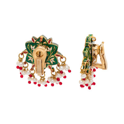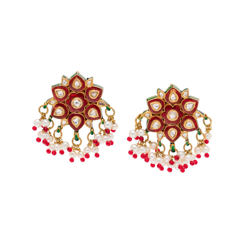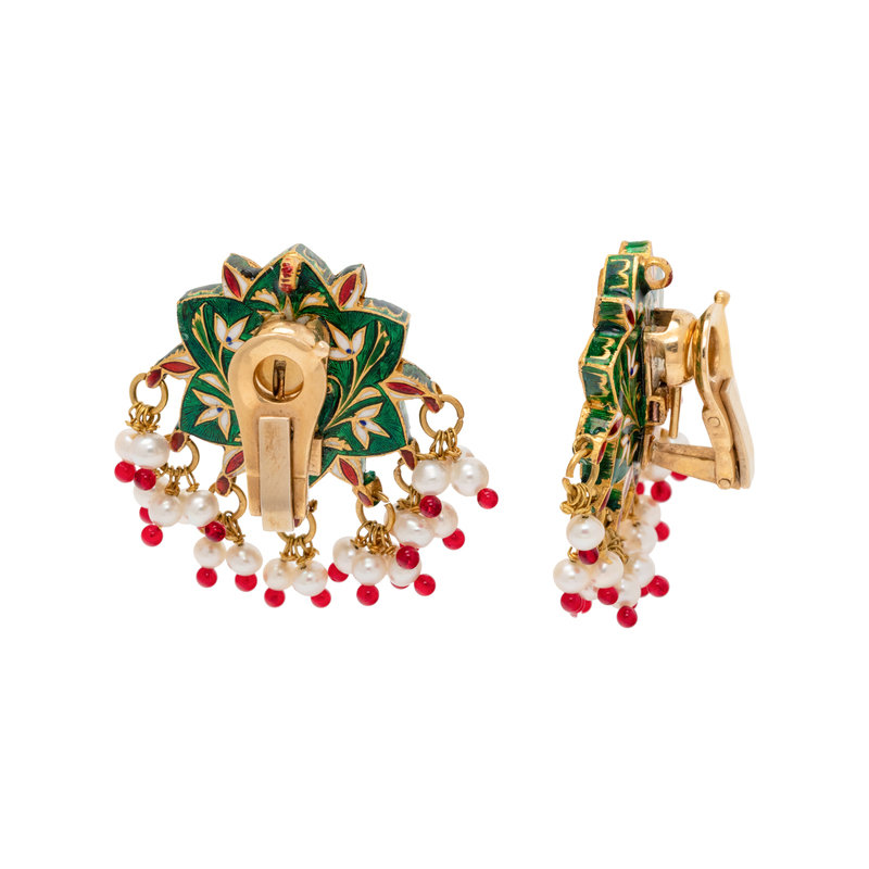 Containing 26 polki cut diamonds with red enamel surround, the reverse with red, green and white enamel in a foliate motif and 42 pearl dangles, folding posts with clip backs.