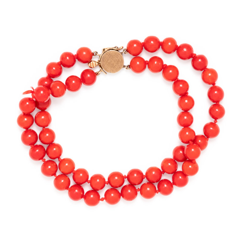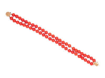 Consisting of two strands of round coral beads measuring approximately 6.85-7.00 mm in diameter, strung knotted with a yellow gold clasp.