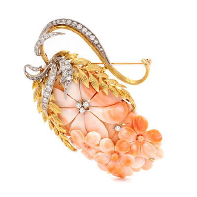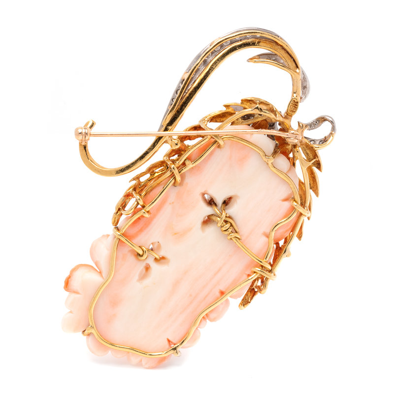 Containing one carved and pierced coral plaque measuring approximately 55.00 x 28.00 mm, 52 round brilliant and single cut diamonds weighing approximately 1.00 carat total. Mounted in bicolor gold.
