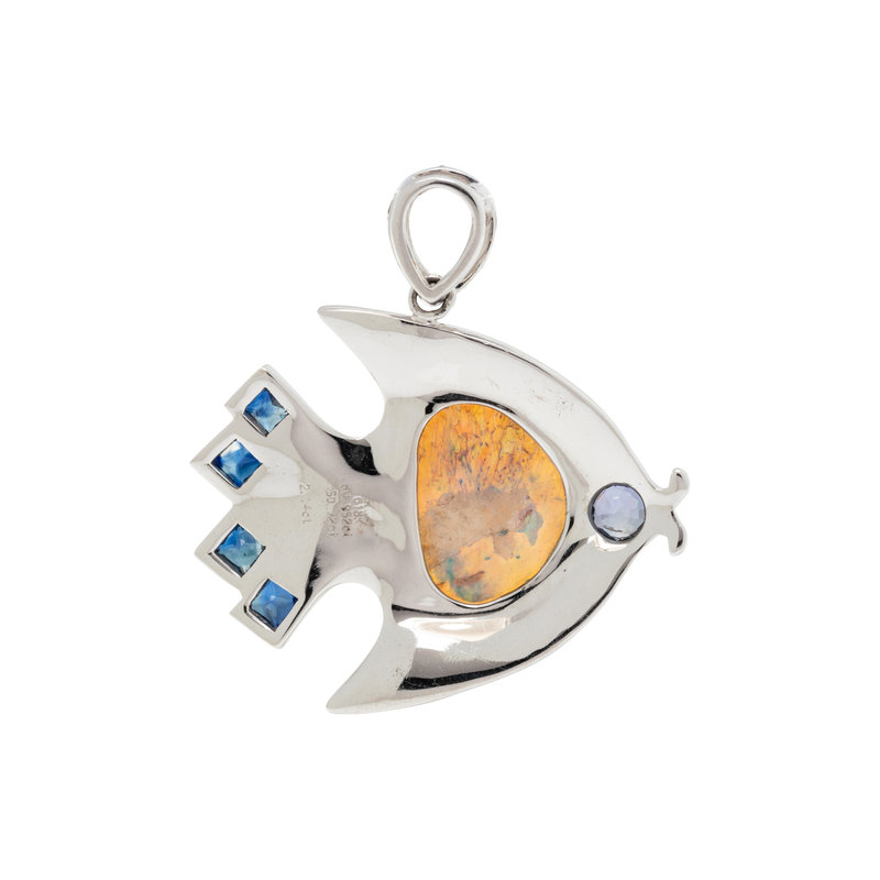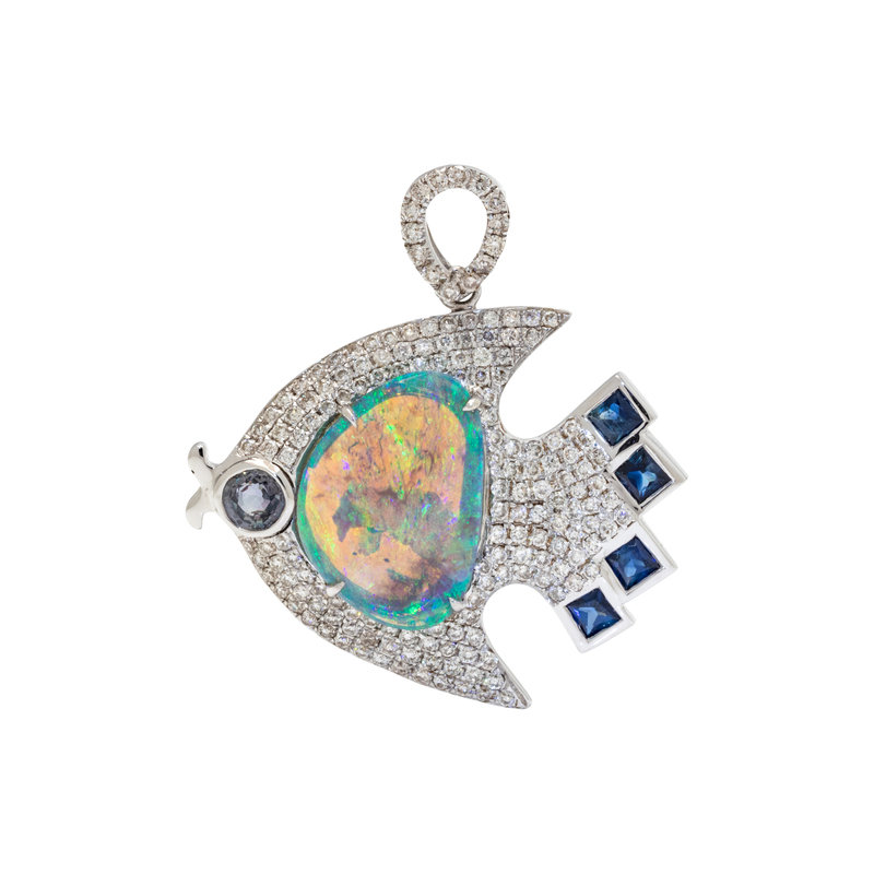 OPAL, DIAMOND AND SAPPHIRE FISH PENDANT