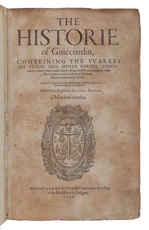 GUICCIARDINI, Francesco (1483-1540). The Historie of Giucciardin, Containing the Warres of Italie and other partes...reduced into English by Geffray Fenton. London: Thomas Vautrollier, 1579.
