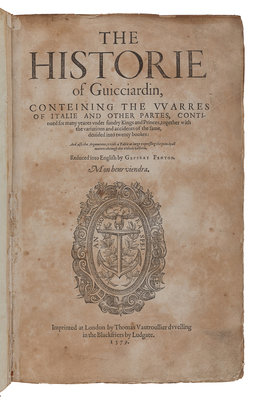 FIRST EDITION IN ENGLISH of La historia d'Italia, "undoubtedly the greatest historical work that had appeared since the beginning of the modern era. It remains ...the final triumph of the Florentine school of philosophical historians which included Machiavelli, Segni, Pitti, Nardi, Farchi, Francescto Vettori and Donato Giannotti " (J. A. Symonds). Guicciardini is regarded as the first "universal" historian, placing Italy within the larger context of the European system of states and demonstrating the interdependence of political events across the continent. ESTC S120755; STC 12458a.