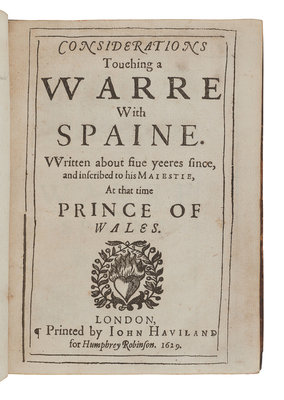 FIRST EDITION, and the first appearance of three of the four tracts included herein: "An advertisement touching an holy warre," "An offer to our late soveraigne King James...", and "The history of the raigne of King Henry the Eighth." "Considerations touching a warre with Spaine" is a "corrupt and surreptitious edition" (editor's preface, not present in this copy). ESTC S100333; STC 1124.