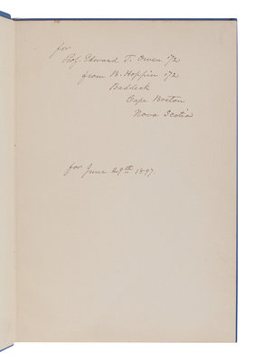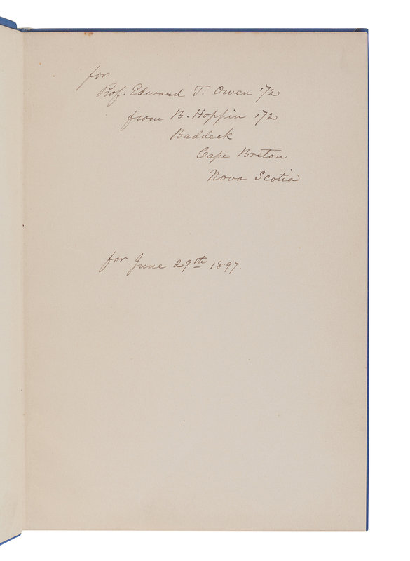 FIRST EDITION, PRESENTATION COPY, INSCRIBED BY HOPPIN: "For Prof. Edward T. Owen ’72 from B. Hoppin ’72 Baddock, Cape Breton, Nova Scotia. For June 29th 1897." Hoppin, Peary's mineralogist, provides a first-hand account of the voyage of the Hope. RARE. Arctic Bib. 7401.
