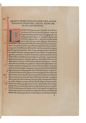 LEO I (ca 360-461, Pope from 400). Sermones et epistolae. Translated from Latin into Italian by Filippo Corsini. Florence: [Antonio di Bartolommeo Miscomini], 21 May 1485.