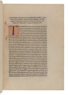 FIRST EDITION IN ITALIAN of Leo I's sermons. The Bishop of Aleria's epistle, beginning on 1v, shows Corsini worked from the Latin edition of Sweynheym and Pannartz, published in 1470 in Rome, or one of its reprints (the present edition omitting a few miscellaneous pieces at the end). BMC VI, 638; BSB-Ink L-104; HC 10016; Goff L-136.