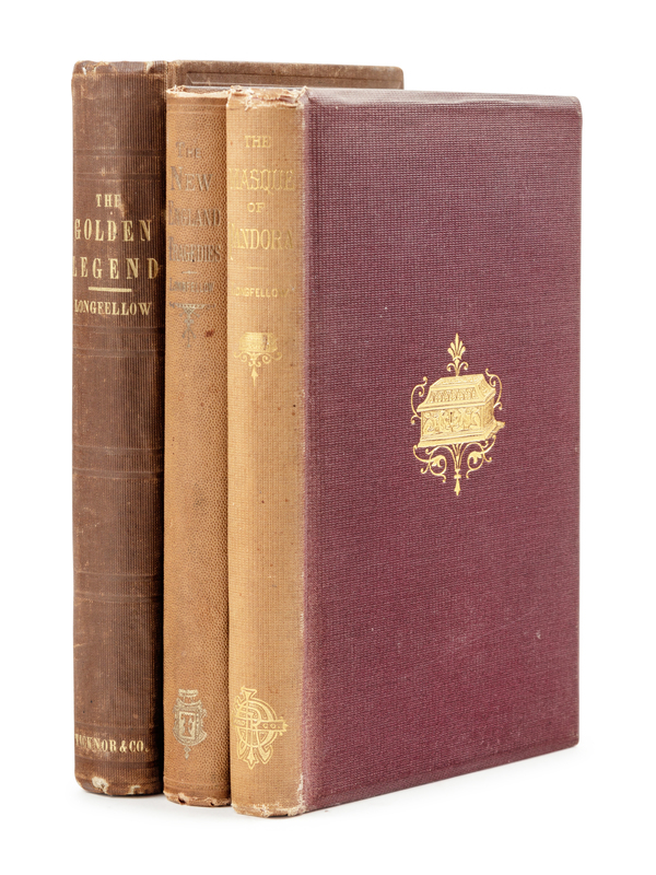 The Golden Legend. Boston: Ticknor, Reed, and Fields, 1851. 4 pp. advertisements dated October 1851. Original brown cloth gilt. BAL 12102 (first printing, title-page dated "M DCCC LI"). -- The New-England Tragedies. Boston: Ticknor and Fields, 1868. Original purple cloth gilt. BAL 12150 (early printing from unbattered type, binding B, no priority.). -- The Divine Tragedy. Boston: James R. Osgood and Company, 1871. Original publisher's green cloth gilt. FIRST EDITION, SIGNED BY LONGFELLOW on title-page. BAL's small paper format, measuring 6 7/8 x 4 1/2". BAL 12157 (small paper format measuring 6 7/8 x 4 1/2"). -- The Masque of Pandora. Boston: James R. Osgood and Company, 1875. Original purple cloth gilt. BAL 12170 (first printing). -- Together, 3 volumes, ALL FIRST EDITIONS, ONE SIGNED BY LONGFELLOW, condition generally good.