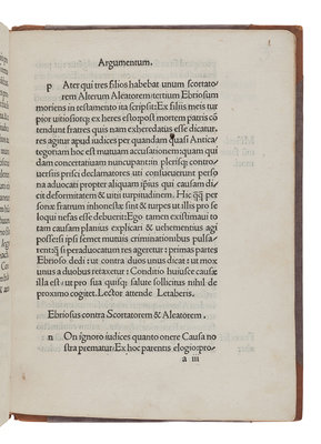 FIRST EDITION with the first word on ff.3 as "Argumentum", and with the colophon as described in Hain. A second edition of the same year has the first word on ff.3 in majuscules and the colophon as described in BMC. Beroaldus' well-known satire against drunkenness, whoring and gambling is written in the form of a dialogue between the three vices. BMC VI, 845 (see note); BSB-Ink B-370; GW 4130; Goff B-471; Hain 2965.