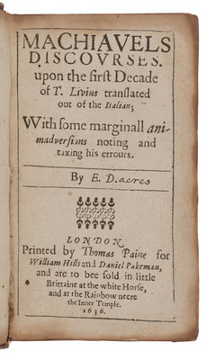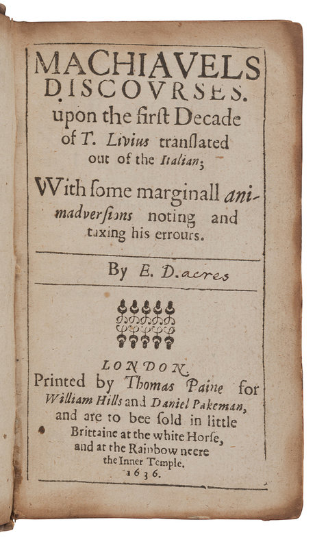 MACHIAVELLI, Niccolò (1469-1527). Machiavels Discourses upon the First Decade of T. Livius. Translated by Edward Dacres. London: Thomas Paine for William Hills and Daniel Pakeman, 1636.