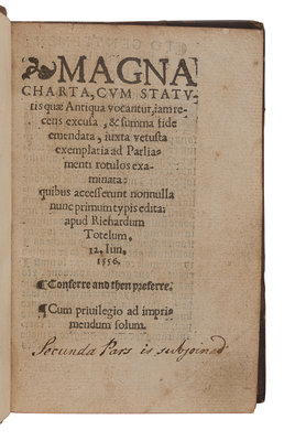 [MAGNA CARTA] Magna Charta, cum statutis quae antiqua vocantur, iam recens excusa, & summa fide emendata, iuxta vetusta exemplaria ad Parliamenti rotulos examinata: quibus accesserunt nonnulla nunc primum typis edita... London: Richard Tottell, 12 June 1556.