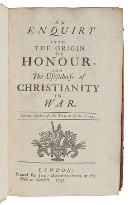 MANDEVILLE, Bernard de (1670?-1733). An Enquiry into the Origin of Honour and The Usefulness of Christianity in War. London: for John Brotherton, 1732.